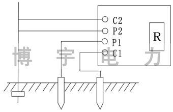 · 沿被測接地極E(C2、P2)和電位探針P1及電流探針C1,依直線彼此相距20米,使電位探針處于E、C中間位置,按要求將探針插入大地。