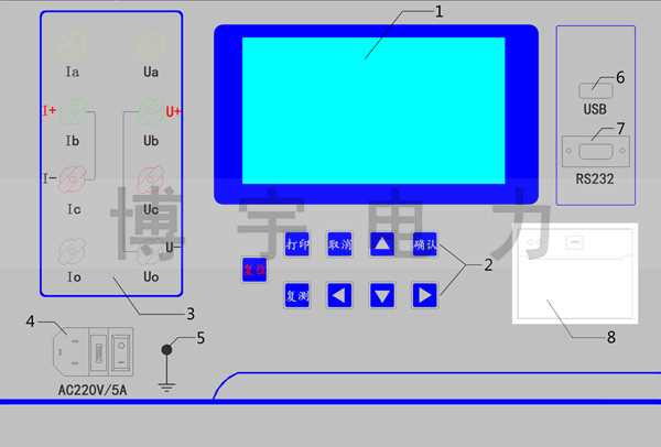 3、測量電流輸出端子和電壓輸入端子:在三通道測量方式時,Ia、Ib,Ic、Io為電流通輸出、輸入通道,Ua、Ub、UC、Uo為電壓輸入通道。在單通道測量方式時I+、I-為電流輸出、輸入通道,U+、U-為電壓輸入通道。