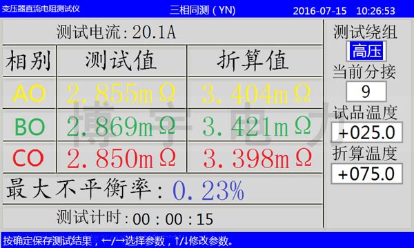 等待測試電流值穩定后,計算并顯示三相電阻值及三相電阻的不平衡率;并且同時顯示設定溫度的折算電阻值,如圖六所示。