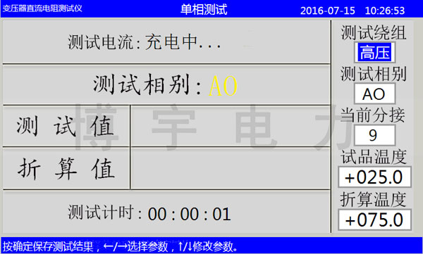 ③ 在上述“三相測試”(圖六)或“單相測試”(圖八)顯示界面中,只有當儀器顯示電阻值后,才可以進行測試數據的存儲和打印操作。此時按“確定”鍵保存當前顯示的測試結果和信息,按“打印”鍵打印當前顯示的測試結果和信息。如果需要修改某一個顯示的設置參數值,可以按“←”或“→”鍵將光標移動到需要修改的參數處,按“↑”或“↓”鍵對參數進行修改。如果需要重復測試按“復測”鍵,復測時電流維持不變,儀器用新測量新數據替換舊數據,并重新顯示測量結果。在儀器開始測試后如果需要退出測試狀態,按“取消”鍵則退出返回到主菜單;注意此時儀器會斷開測試電流回路,電感性試品會因此產生一個放電過程,放電時儀器中的蜂鳴器發出提示聲音,此時需等待放電過程結束后才可以拆除測試線。