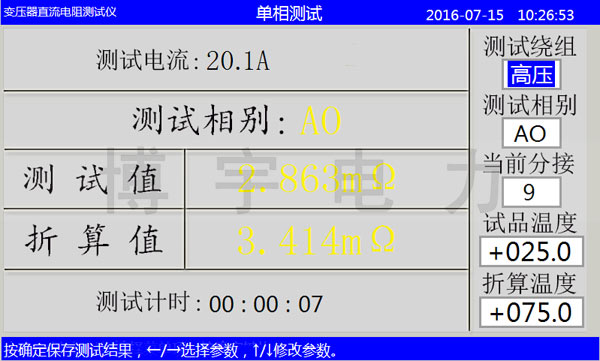 ② 在圖四中當選中并執行“單相測試”菜單后,采用單通道方式對單相繞組的電阻進行測試,顯示如圖七。