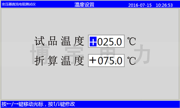 在如圖四界面,當選中并執行“溫度設置”菜單后,進入溫度參數設置界面,顯示如圖九。該功能可以實現在測試開始前完成試品溫度和參考折算溫度的設置,這兩個溫度值與三相測試(圖五、六)和單相測試(圖七、八)顯示的溫度值一致。按“←”或“→”鍵移動光標到需要修改的參數,按“↑”或“↓”鍵修改選中的參數。
