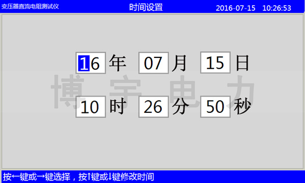 在圖四主菜單下,將選擇光標移動到<時間設置>項后按'打印當前顯示的測試結果和信息。如果需要修改某一個顯示的設置參數值,可以按“確定”鍵,對日歷時間進行校正,顯示如圖十一。