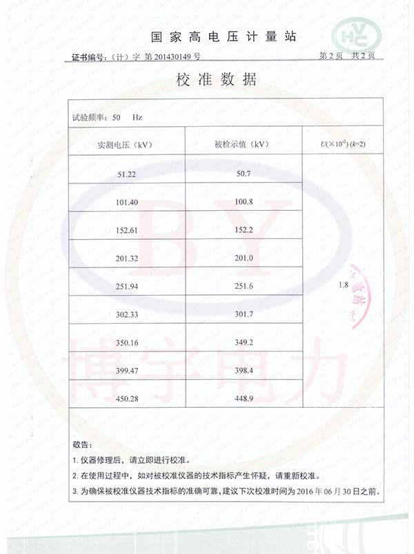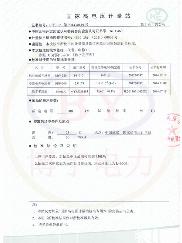 FRC-500kV/300pF串聯諧振耐壓試驗裝置校準證書