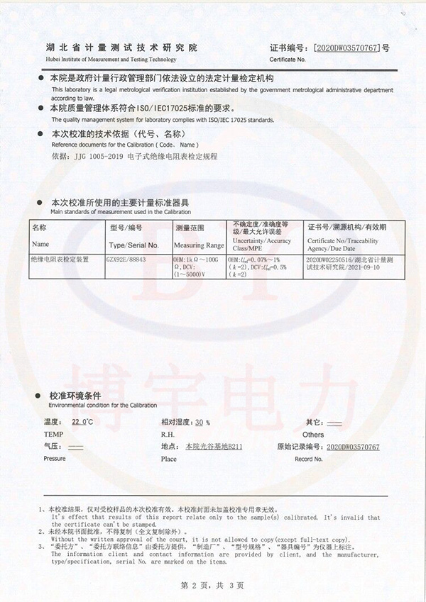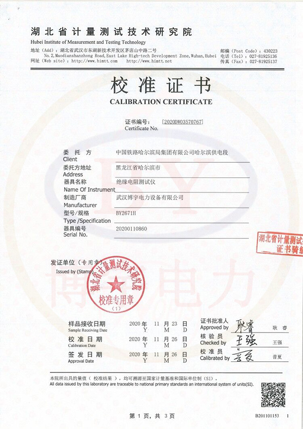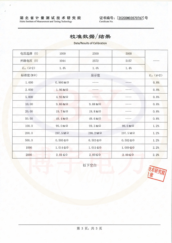 BY2671F數(shù)字兆歐表校準(zhǔn)證書