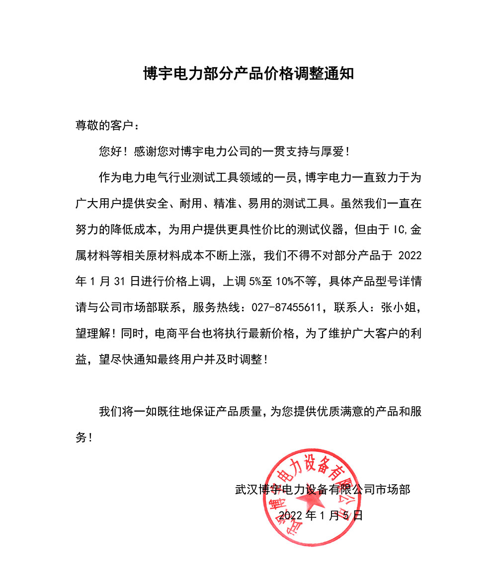 作為電力電氣行業測試工具領域的一員,博宇電力一直致力于為廣大用戶提供安全、耐用、精準、易用的測試工具。雖然我們一直在努力的降低成本,為用戶提供更具性價比的測試儀器,但由于IC,金屬材料等相關原材料成本不斷上漲,我們不得不對部分產品于2022年1月31日進行價格上調,上調5%至10%不等,具體產品型號詳情請與公司市場部聯系,服務熱線:027-87455611,聯系人:張小姐,望理解!同時,電商平臺也將執行最新價格,為了維護廣大客戶的利益,望盡快通知最終用戶并及時調整!