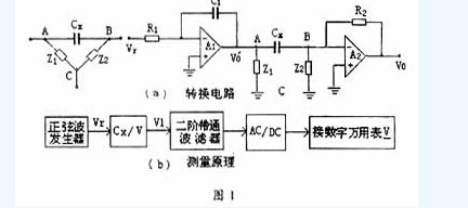 根據微分積分電路性質,可將電容的測量轉換成電壓測量。測量原理和轉換電路圖如圖1。