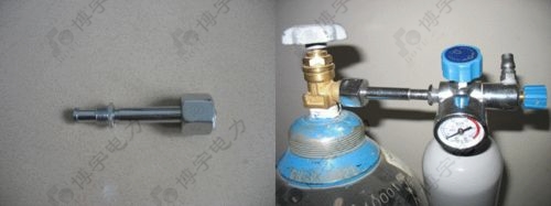 檢查試驗用氣罐有無試驗用氣源(氮氣或SF6氣體),如無試驗用氣源無或氣壓不足(氣壓不能小于0.8MPa)需做好充氣工作(建議用戶到專業充氣點充好氣源,且氣壓不能大于2.0MPa),如無當地無專業充氣點用戶也可用我公司配備的充氣桿與氣源對接自行充氣,如下圖所示: