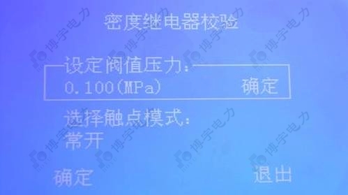 進入“選擇觸點模式”菜單后用飛梭可以選擇密度繼電器的觸點模式,有“常開”和“常閉”兩個選項。注意:觸點模式是指密度繼電器非帶載的狀態。設置完成后旋轉飛梭到最下面的“確定”選項,按“飛梭確定鍵”進入下一級菜單。