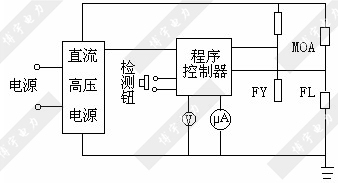 人工按一下檢測鈕,便啟動直流高壓電源,由程序控制器從FL上采樣,產生1mA的恒流通過MOA,經FY自動測量U1mA,然后又由程序控制器發出指令產生0.75 U1mA的恒定電壓加在MOA上,進而從FL上測得流過MOA的電流Id以LCD數字分別顯示在兩塊表頭上,并可長時間保存,以便讀數。最后,程序控制器關閉直流高壓電源,自動放電,發出安全指示,告知測量完畢。